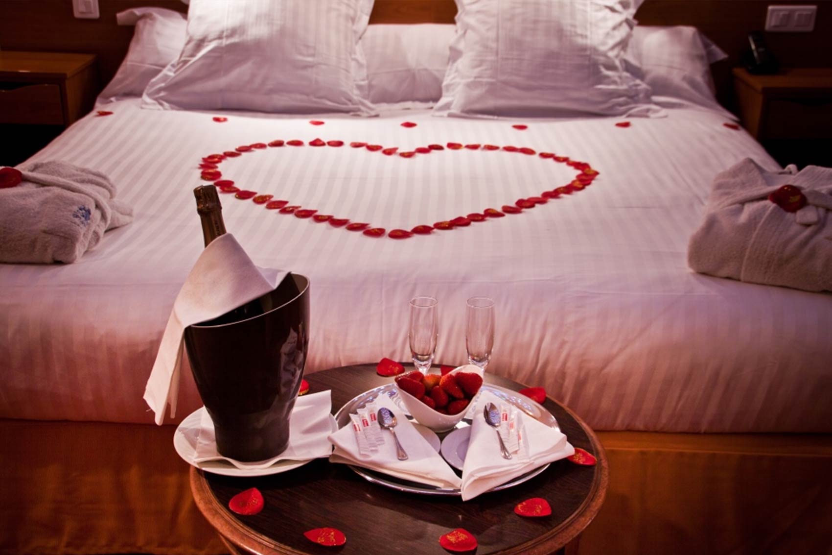 A romantic welcoming with rose petals, delicacies and a botlle of Prosecco ,