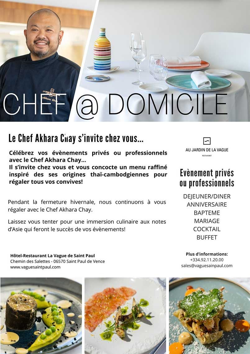 Pendant la saison d’hiver, l’hôtel et le restaurant ferment leurs portes mais notre Chef continue de vous régaler avec le service Chef à Domicile.